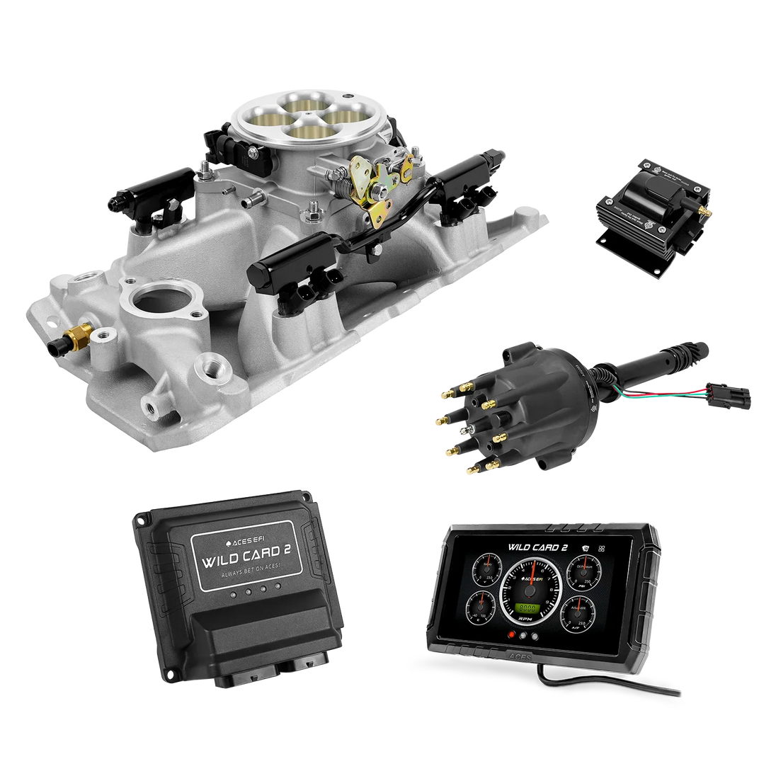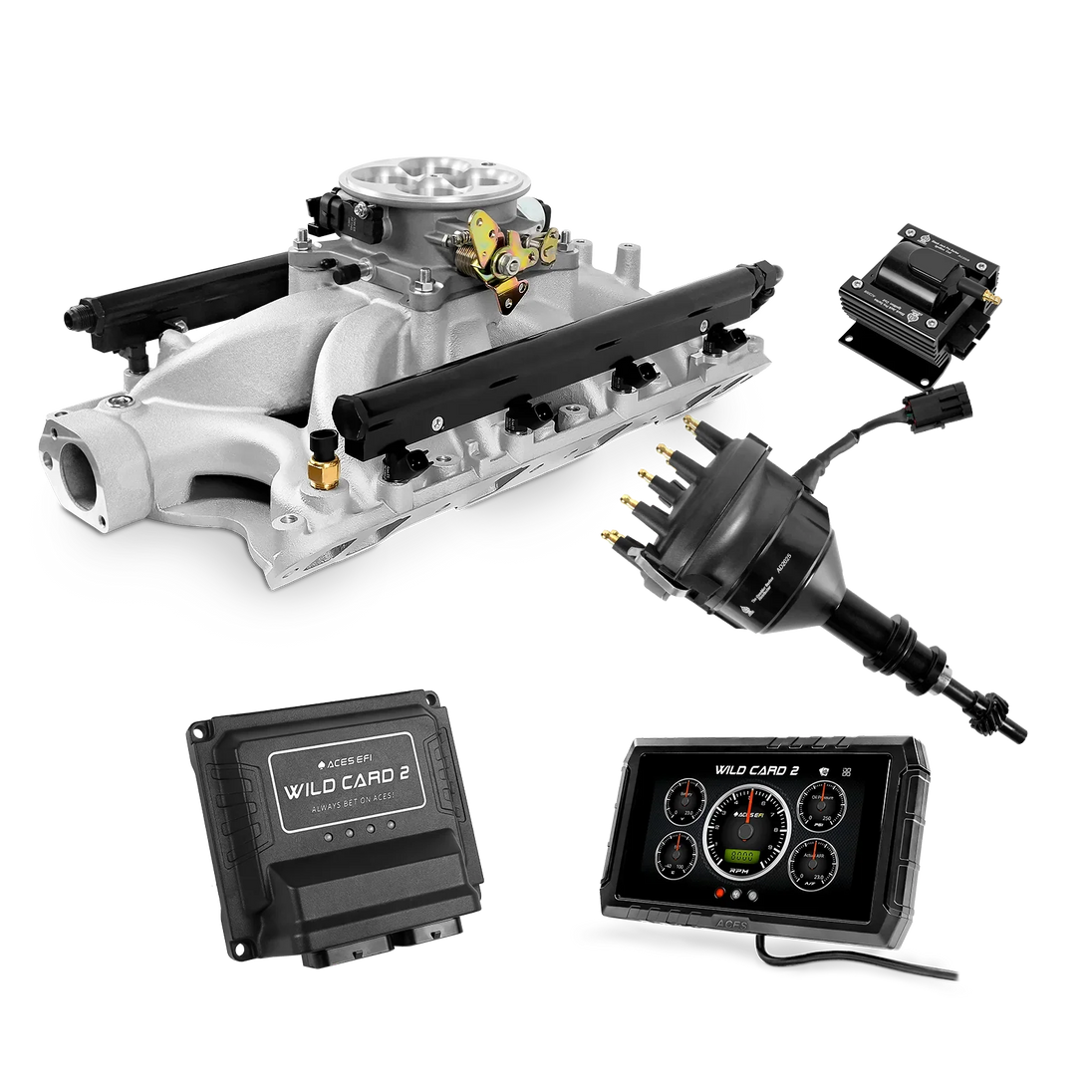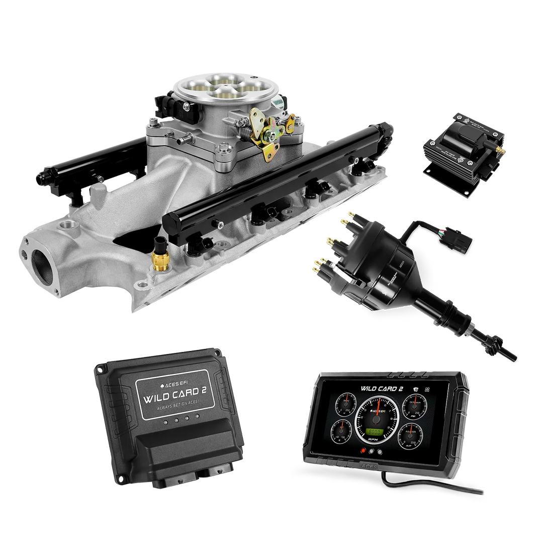 The Aces Wild Card 2 is a fully customizable, true Sequential Multi-Port EFI (MPEFI) system engineered for classic 8-cylinder engines. Unlike traditional TBI setups or aftermarket systems that use bank-to-bank injection, the Wild Card 2 delivers precise fuel metering to each cylinder, giving you superior throttle response, balanced fuel distribution, and more power across the RPM range.