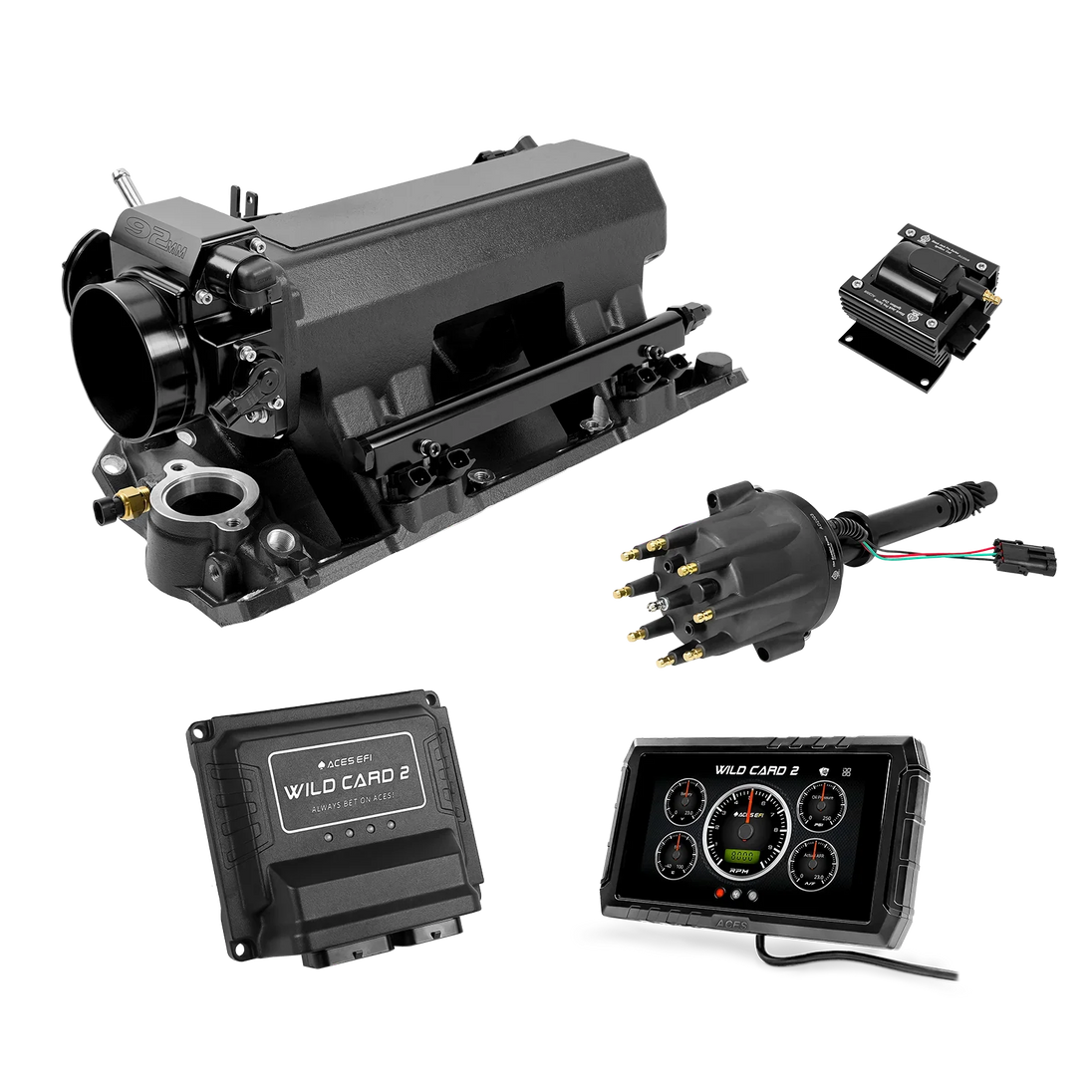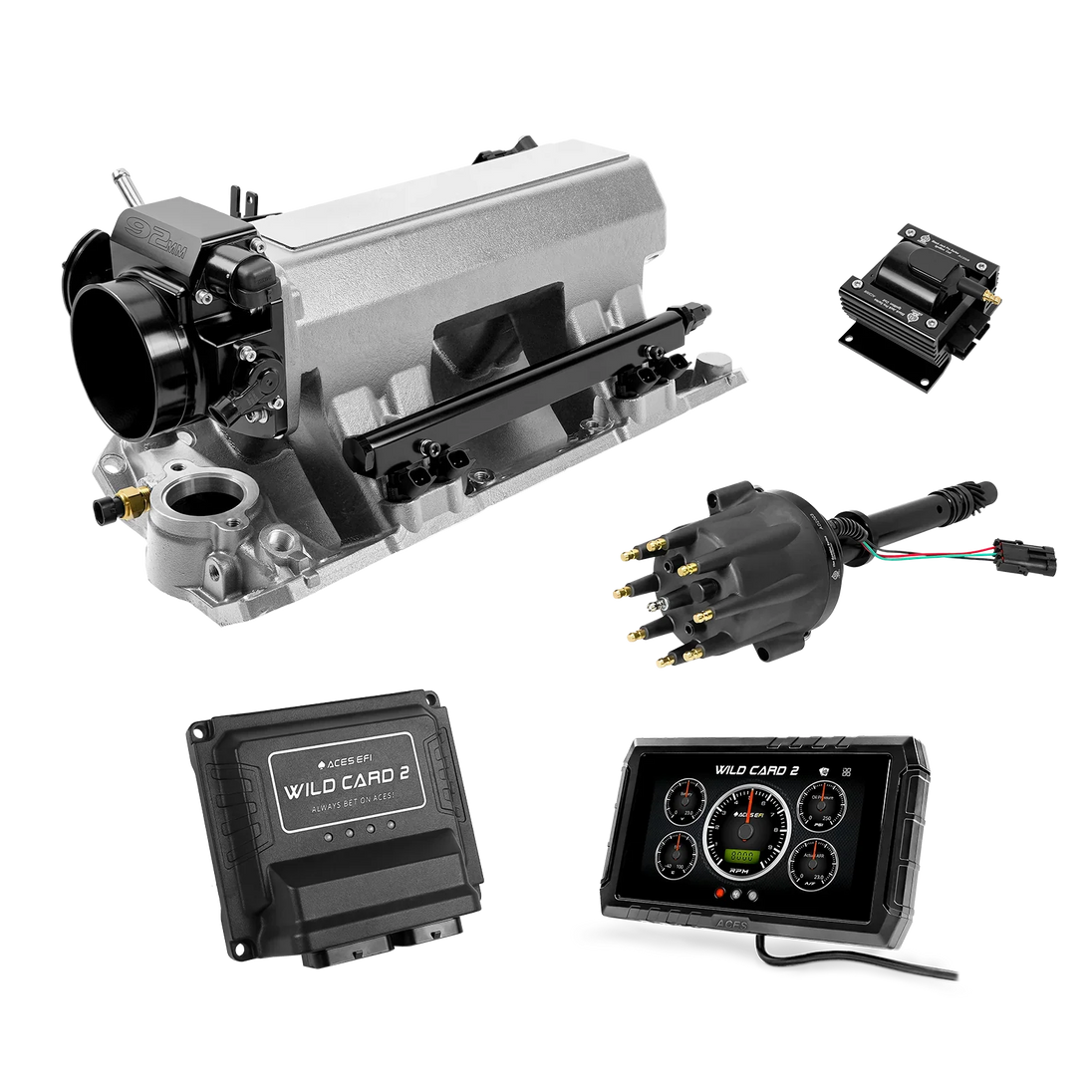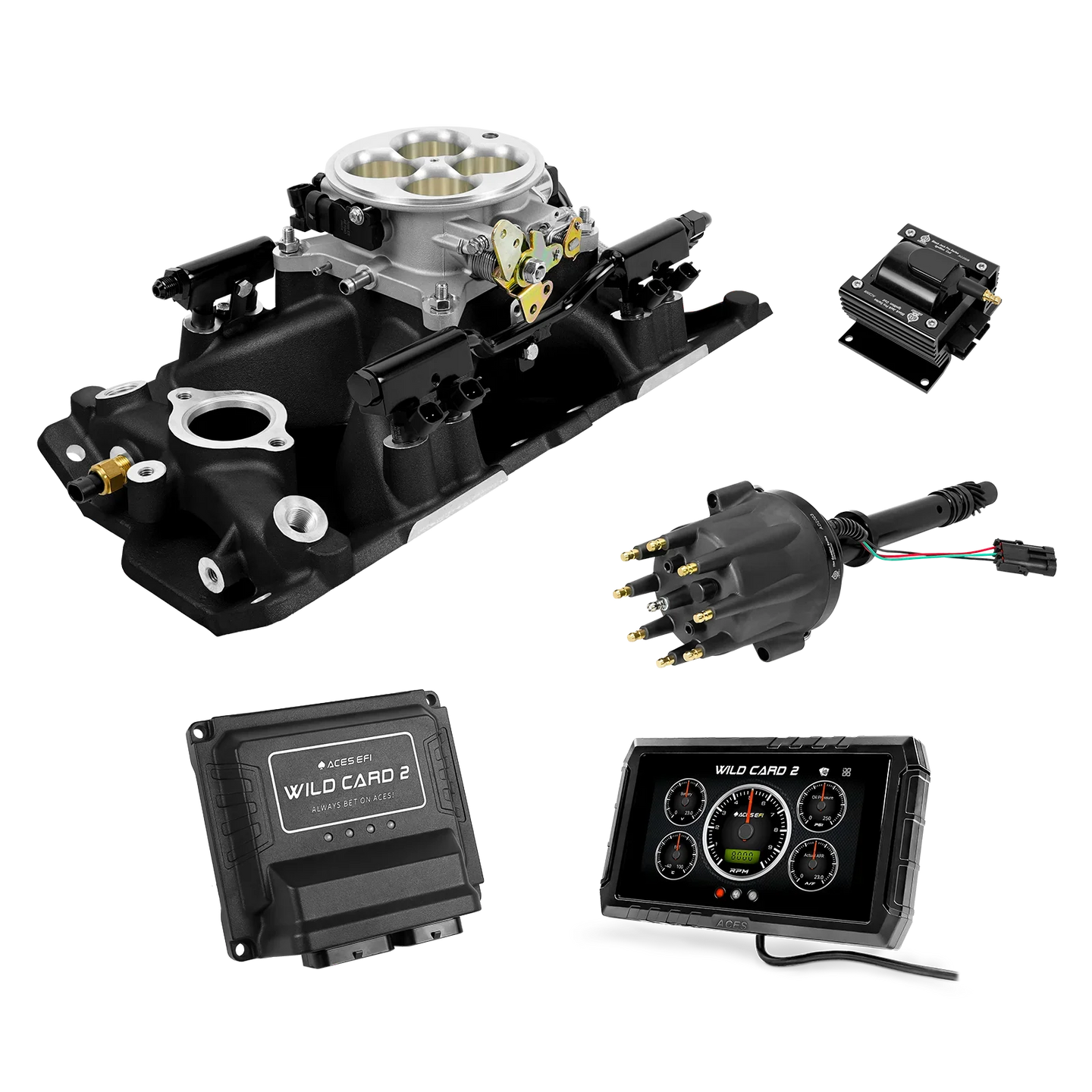 The Aces Wild Card 2 is a fully customizable, true Sequential Multi-Port EFI (MPEFI) system engineered for classic 8-cylinder engines. Unlike traditional TBI setups or aftermarket systems that use bank-to-bank injection, the Wild Card 2 delivers precise fuel metering to each cylinder, giving you superior throttle response, balanced fuel distribution, and more power across the RPM range.