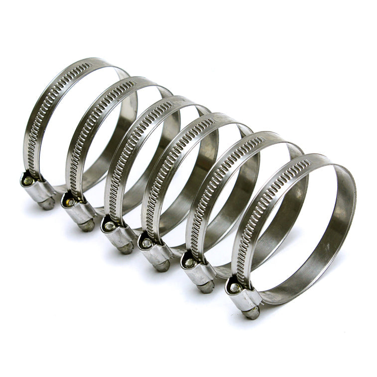 HPS 100% Stainless Steel Embossed Hose Clamps SAE # 40 6pcs pack 2" - 3" (51mm-76mm) are ideal for aircraft, heavy-duty industrial applications as well as outdoor, fresh water and mildly corrosive applications. HPS embossed clamp is design to prevent hose damage during installation and does not corrode like the standard worm gear clamp. The non-perforated band keeps soft silicone hoses from shearing or extruding during installation. The one piece housing design helps maintaining the integrity of the connection and provides a strong seal. Technical Specification: SAE # 40. 100% Stainless Steel. 12mm (1/2") band. 7mm slotted hex head. Heavy duty industrial grade one-piece housing design. Rolled edges prevent hose damage during installation. Effective Diameter Range: 2" - 3" (51mm-76mm). Recommend to use on HPS hoses with inside diameter range from 2" - 2-9/16" (51mm - 65mm). Maximum Torque Spec: 35 in lbs. Exceeds all SAE requirements. REMARK: Sold in box of 6.