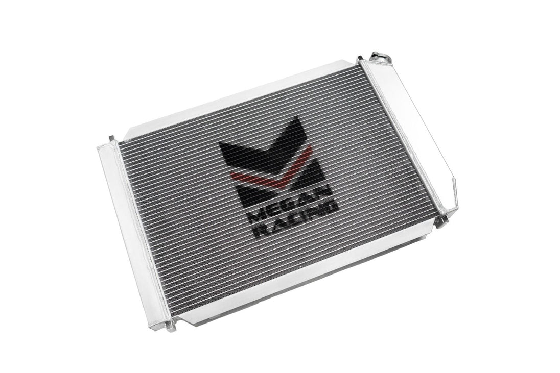 Megan Racing Radiators are comprised completely of aluminum. From the tanks to the primary core. Aluminum tanks are a great upgrade over the plastic usually found on factory radiators which are known to crack and leak especially as they age. The larger heat exchanging core is not only more efficient at transferring heat from the coolant, but also increases total coolant carrying capacity.