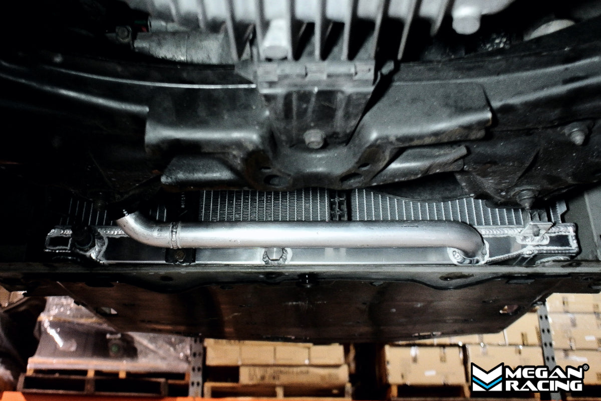 Megan Racing Radiators are comprised completely of aluminum. From the tanks to the primary core. Aluminum tanks are a great upgrade over the plastic usually found on factory radiators which are known to crack and leak especially as they age. The larger heat exchanging core is not only more efficient at transferring heat from the coolant, but also increases total coolant carrying capacity.