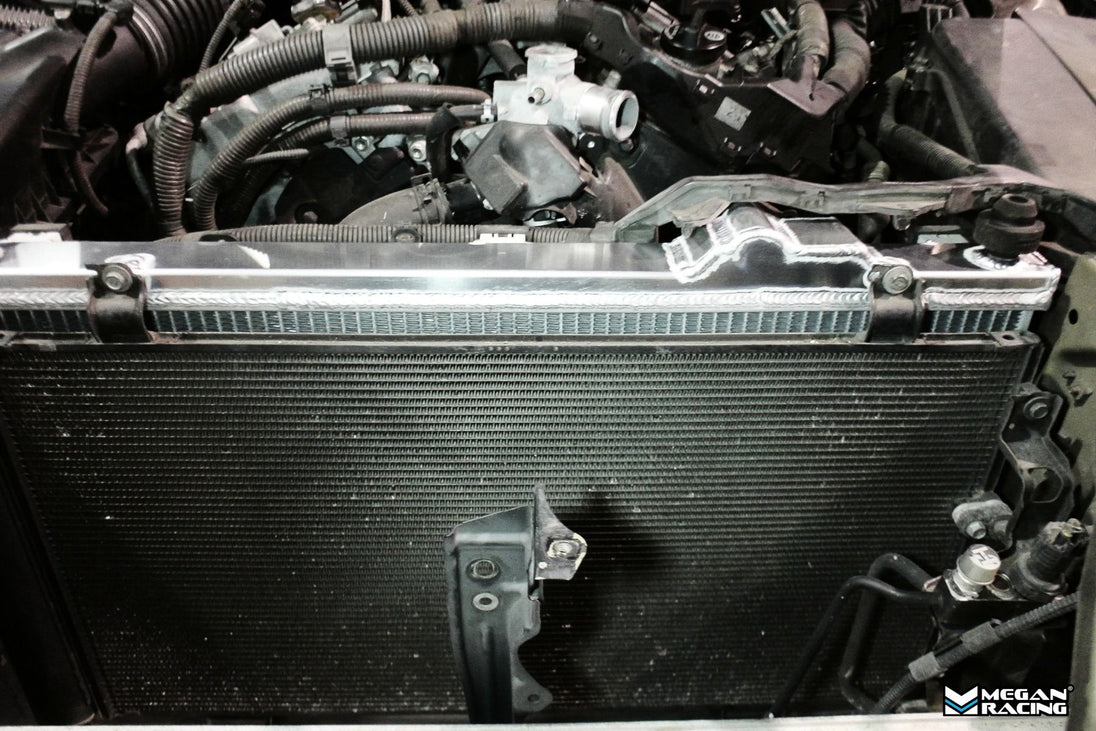 Megan Racing Radiators are comprised completely of aluminum. From the tanks to the primary core. Aluminum tanks are a great upgrade over the plastic usually found on factory radiators which are known to crack and leak especially as they age. The larger heat exchanging core is not only more efficient at transferring heat from the coolant, but also increases total coolant carrying capacity.