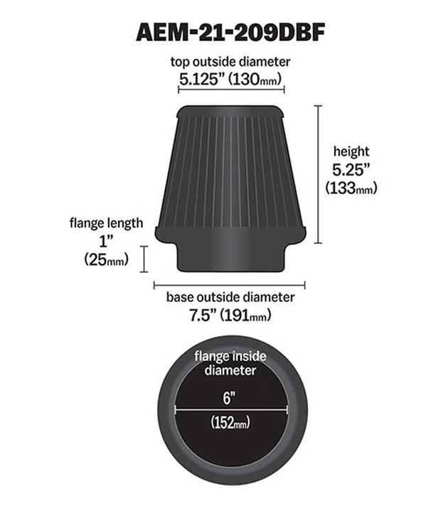 AEM Induction AEM DryFlow Air Filter 7.5in Base OD / 5.125in Top OD / 6in Flange ID / 6.125in Height 21-209DBF