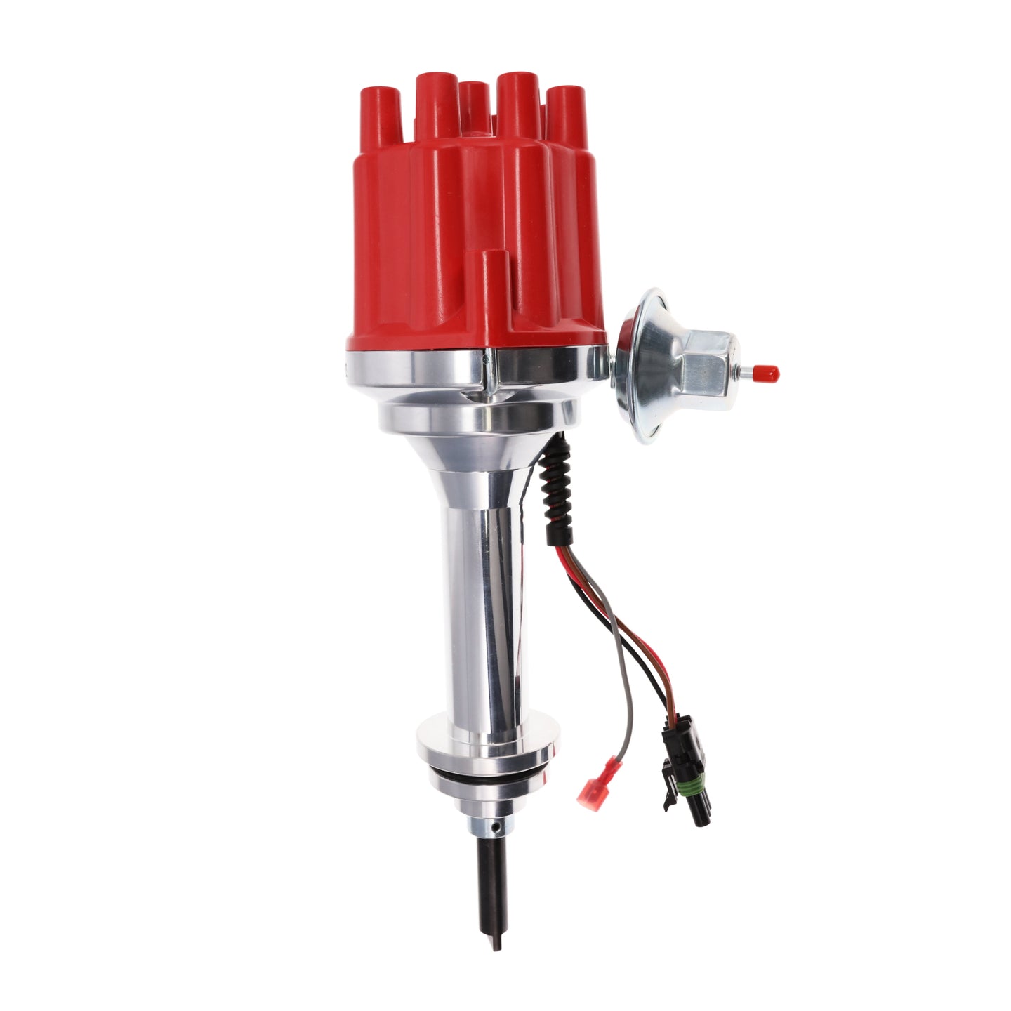TSP Pro Series Ready to Run Distributor is perfect for a street performance upgrade. It features a CNC-machined billet aluminum body and hardened steel shaft, with a sealed ball bearing on top and a sintered steel bushing on the bottom. It also comes with a fully adjustable mechanical advance, vacuum advance, magnetic pickup trigger, and a high-output circuit board module with digital tach output. The dielectric cap comes with solid brass terminals and a color-matched wire retainer. Vehicle Specific