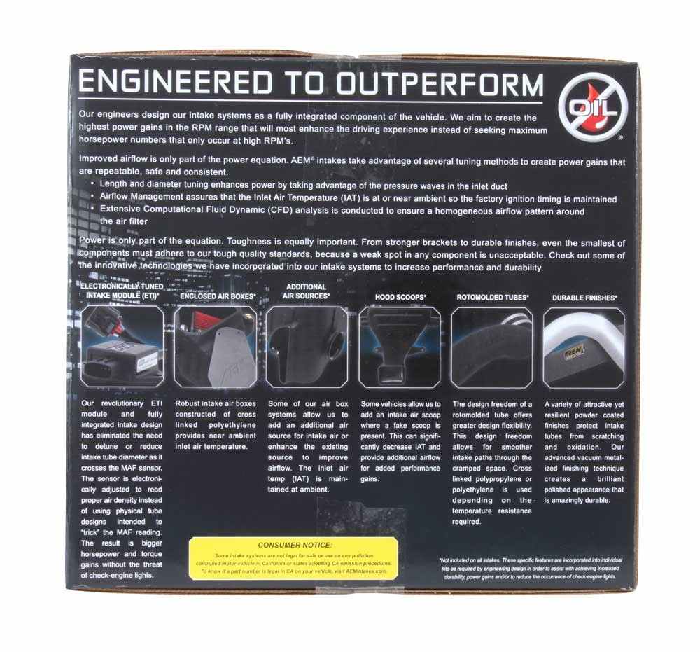 AEM's Performance Cold Air Intake Systems are designed, tuned and dyno-tested to give your engine more power and acceleration by replacing the restrictive factory air filter, air intake tubing and air box assembly.